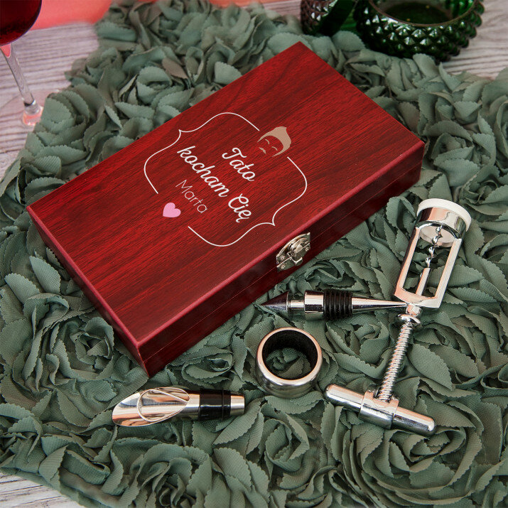 Szukasz czegoś szczególnego na Dzień Ojca? A może zbliżają się urodziny taty? Co powiesz na zestaw do wina w eleganckiej skrzyneczce, na której znajduje się grawer z wyznaniem specjalnie dla niego? Taki upominek zrobi wrażenie, a praktyczne akcesoria pozwolą jeszcze bardziej cieszyć się wolnym wieczorem z odrobiną ulubionego trunku.