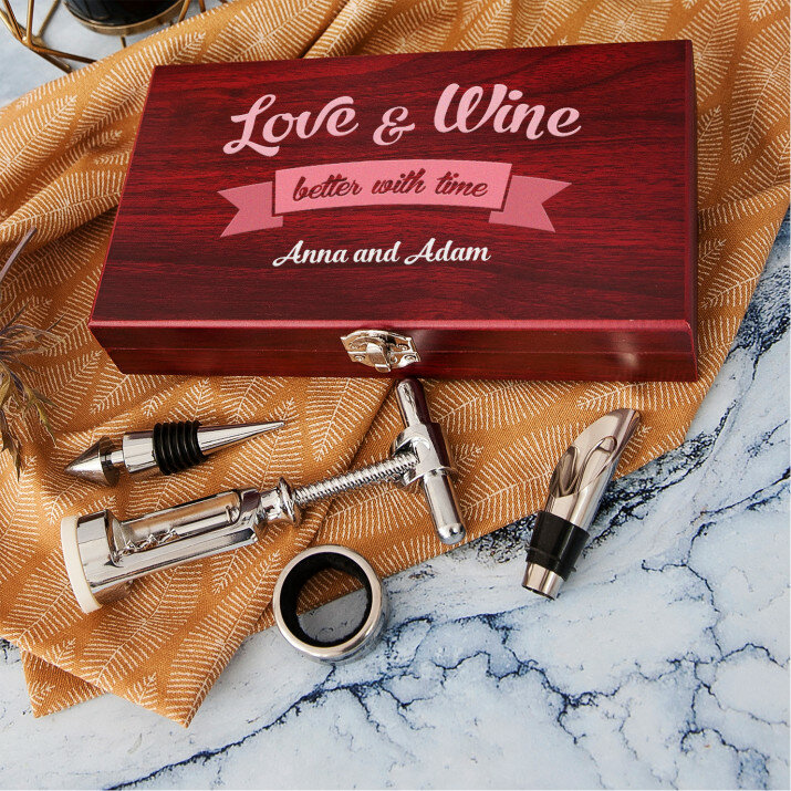 Piękny, czteroczęściowy zestaw do wina w eleganckim drewnianym pudełku z grawerem na pokrywce.