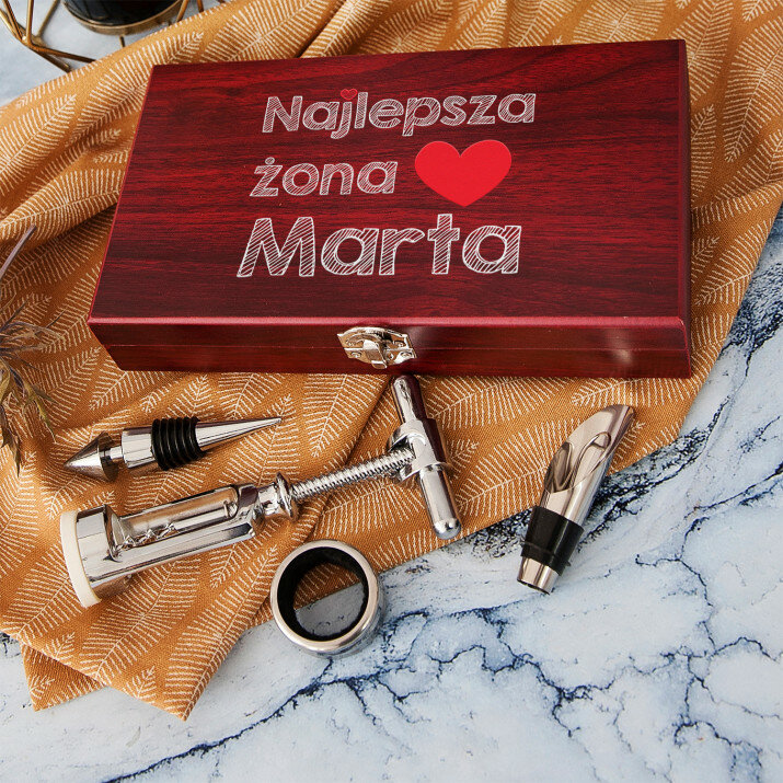 Piękny, czteroczęściowy zestaw do wina w eleganckim drewnianym pudełku z grawerem na pokrywce.