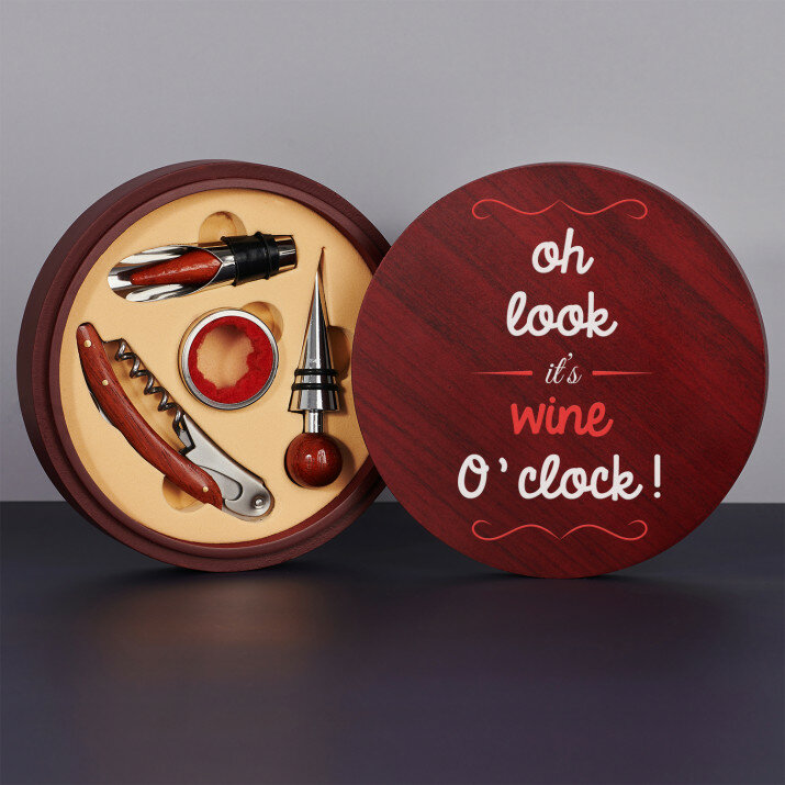 Zestaw okrągły, który zawiera nóż kelnerski, dwie zatyczki ozdobione korkiem oraz opaskę na butelkę. Wymiary tego zestawu to 162 x 40 mm.