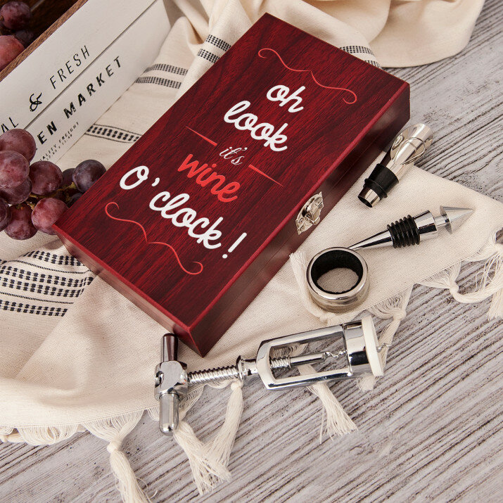 Piękny, czteroczęściowy zestaw do wina w eleganckim drewnianym pudełku z grawerem na pokrywce.Do wyboru są dwie wersje: