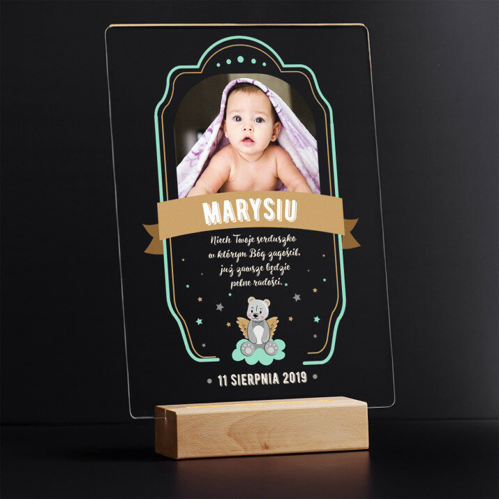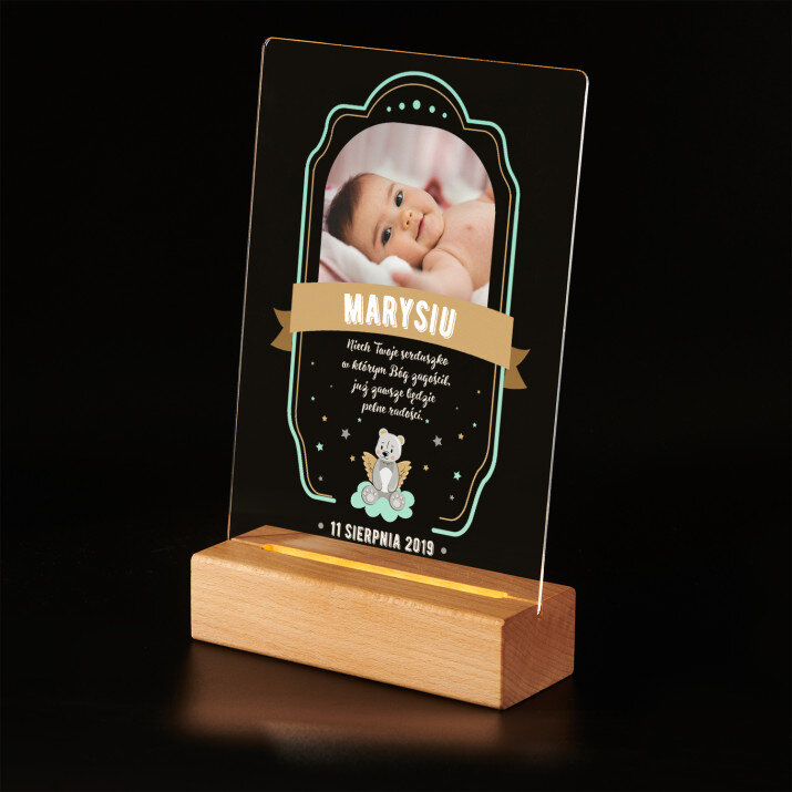 Wyjątkowa pamiątka, która zachwyci obdarowaną osobę! Wydruk na bezbarwnym szkle akrylowym (pleksiglas) o grubości 2 mm to upominek na lata. Materiał wyróżnia się doskonałą jakością powierzchni i sztywnością, jest odporny na uszkodzenia oraz warunki atmosferyczne.Podstawka LED wykonana jest z drewna bukowego. Temperatura barwowa 3000K zapewnia ciepłe, nastrojowe światło, dzięki któremu personalizowana pamiątka będzie wyglądać niczym najpiękniejszy skarb. Gwarantujemy, że będzie to świetna niespodzianka dla Twoich bliskich!