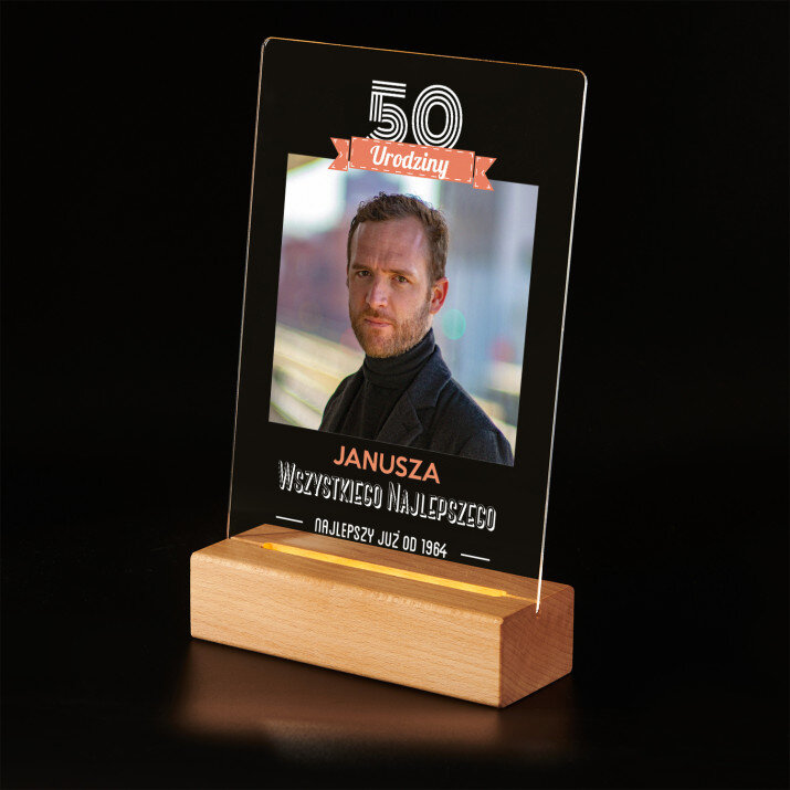 Wydruk na szkle akrylowym z podstawką drewnianą LED.