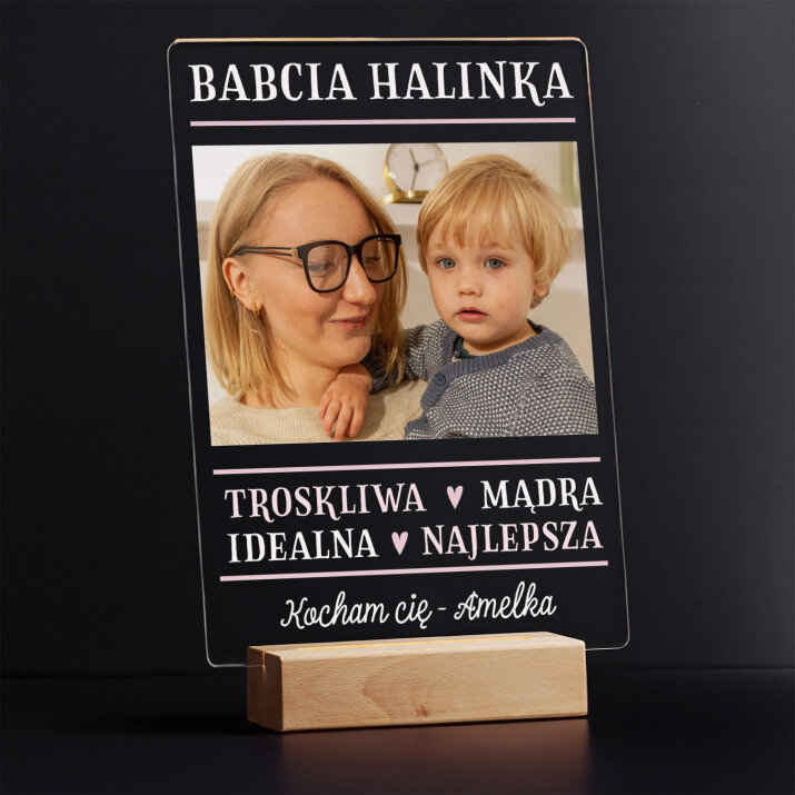 Wydruk na szkle akrylowym z podstawką drewnianą LED.