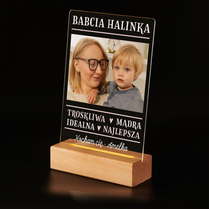 Wyjątkowa pamiątka, która zachwyci obdarowaną osobę! Wydruk na bezbarwnym szkle akrylowym (pleksiglas) o grubości 3 mm to upominek na lata. Materiał wyróżnia się doskonałą jakością powierzchni i sztywnością, jest odporny na uszkodzenia oraz warunki atmosferyczne.Podstawka LED wykonana jest z drewna bukowego. Temperatura barwowa 3000K zapewnia ciepłe, nastrojowe światło, dzięki któremu personalizowana pamiątka będzie wyglądać niczym najpiękniejszy skarb. Gwarantujemy, że będzie to świetna niespodzianka dla Twoich bliskich!
