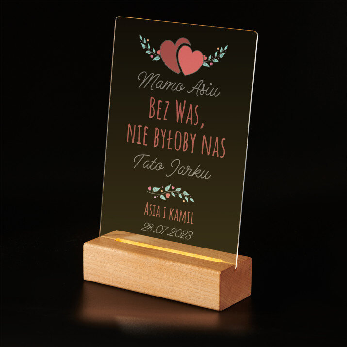 Wyjątkowa pamiątka, która zachwyci obdarowaną osobę! Wydruk na bezbarwnym szkle akrylowym (pleksiglas) o grubości 3 mm to upominek na lata. Materiał wyróżnia się doskonałą jakością powierzchni i sztywnością, jest odporny na uszkodzenia oraz warunki atmosferyczne.Podstawka LED wykonana jest z drewna bukowego. Temperatura barwowa 3000K zapewnia ciepłe, nastrojowe światło, dzięki któremu personalizowana pamiątka będzie wyglądać niczym najpiękniejszy skarb. Gwarantujemy, że będzie to świetna niespodzianka dla Twoich bliskich!
