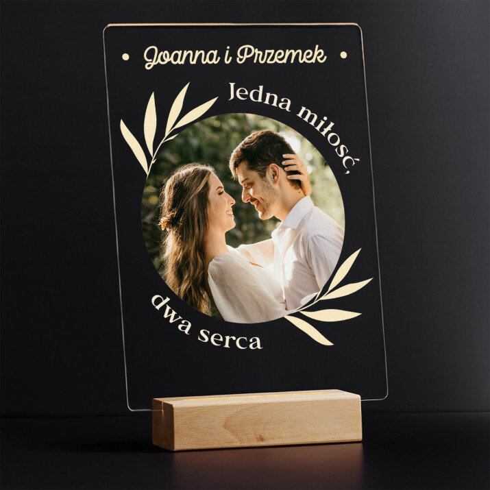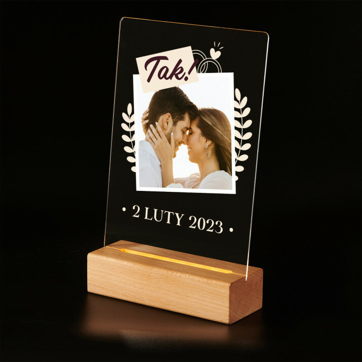 Wyjątkowa pamiątka, która zachwyci obdarowaną osobę! Wydruk na bezbarwnym szkle akrylowym (pleksiglas) o grubości 2 mm to upominek na lata. Materiał wyróżnia się doskonałą jakością powierzchni i sztywnością, jest odporny na uszkodzenia oraz warunki atmosferyczne.Podstawka LED wykonana jest z drewna bukowego. Temperatura barwowa 3000K zapewnia ciepłe, nastrojowe światło, dzięki któremu personalizowana pamiątka będzie wyglądać niczym najpiękniejszy skarb. Gwarantujemy, że będzie to świetna niespodzianka dla Twoich bliskich!