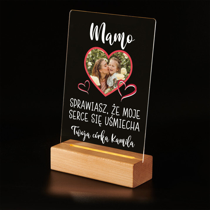 Wydruk na szkle akrylowym z podstawką drewnianą LED.
