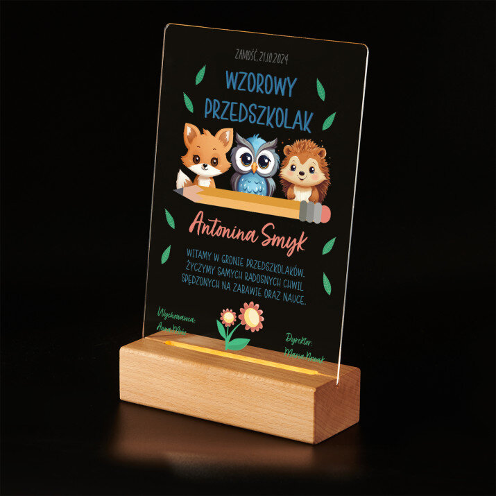 Wydruk na szkle akrylowym A4 z podstawką drewnianą LED