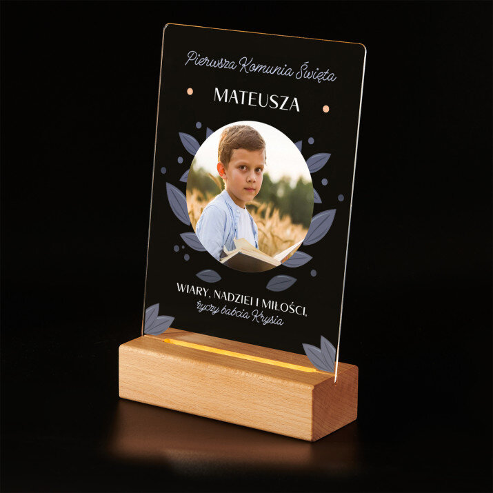 Wydruk na szkle akrylowym z podstawką drewnianą LED.