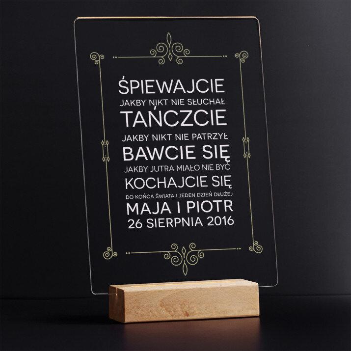 Wydruk na szkle akrylowym z podstawką drewnianą LED.