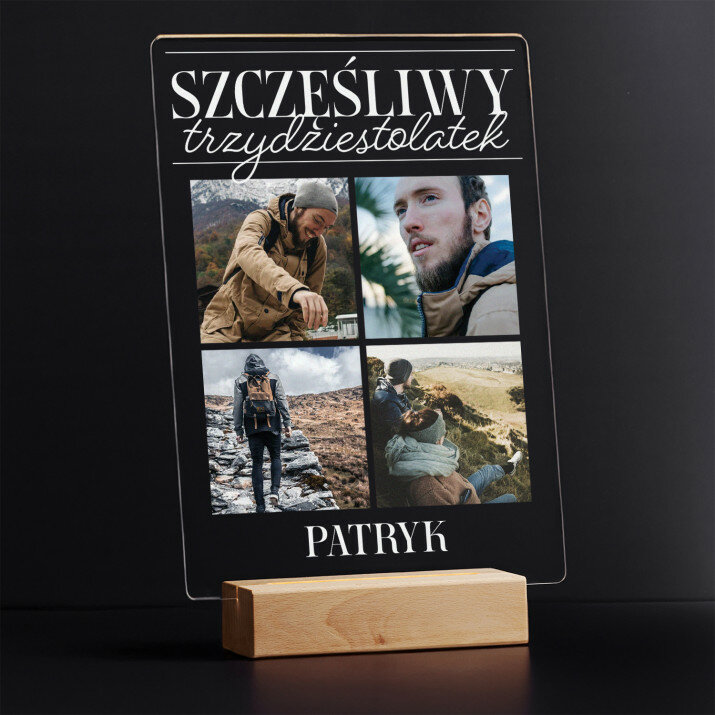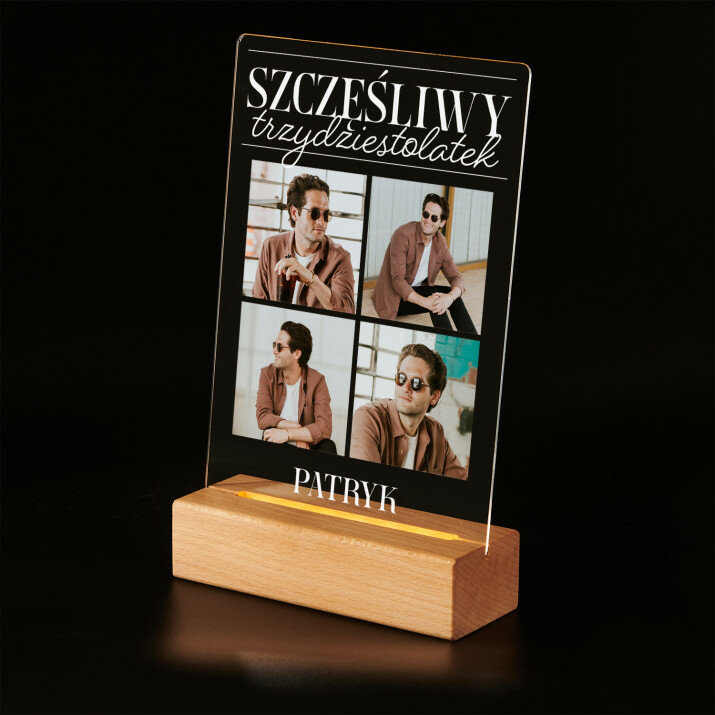 Wydruk na szkle akrylowym z podstawką drewnianą LED.