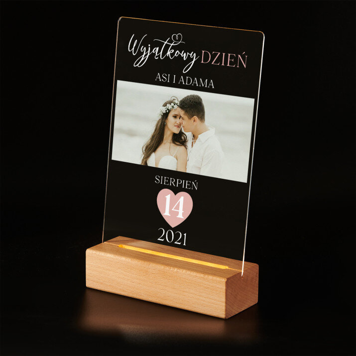 Wyjątkowa pamiątka, która zachwyci obdarowaną osobę! Wydruk na bezbarwnym szkle akrylowym (pleksiglas) o grubości 3 mm to upominek na lata. Materiał wyróżnia się doskonałą jakością powierzchni i sztywnością, jest odporny na uszkodzenia oraz warunki atmosferyczne.Podstawka LED wykonana jest z drewna bukowego. Temperatura barwowa 3000K zapewnia ciepłe, nastrojowe światło, dzięki któremu personalizowana pamiątka będzie wyglądać niczym najpiękniejszy skarb. Gwarantujemy, że będzie to świetna niespodzianka dla Twoich bliskich!