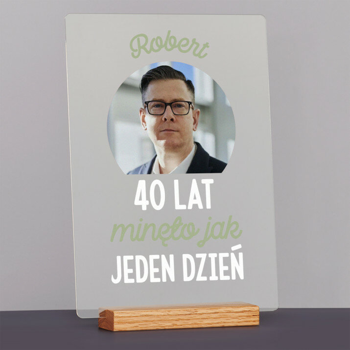 Wydruk na szkle akrylowym z podstawką drewnianą.