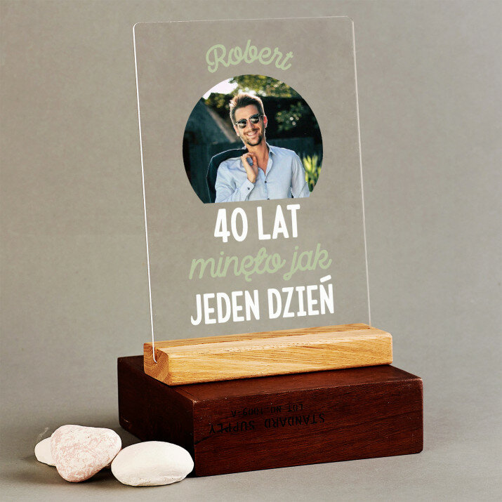 Wyjątkowa pamiątka, która zachwyci obdarowaną osobę! Wydruk na bezbarwnym szkle akrylowym (pleksiglas) o grubości 2 mm to upominek na lata. Materiał wyróżnia się doskonałą jakością powierzchni i sztywnością, jest odporny na uszkodzenia oraz warunki atmosferyczne. Dzięki eleganckiej, drewnianej podstawce wydruk można od razu postawić na półce. Gwarantujemy, że będzie to świetna niespodzianka dla Twoich bliskich!Oferujemy cztery różne opcje dla tego wydruku: