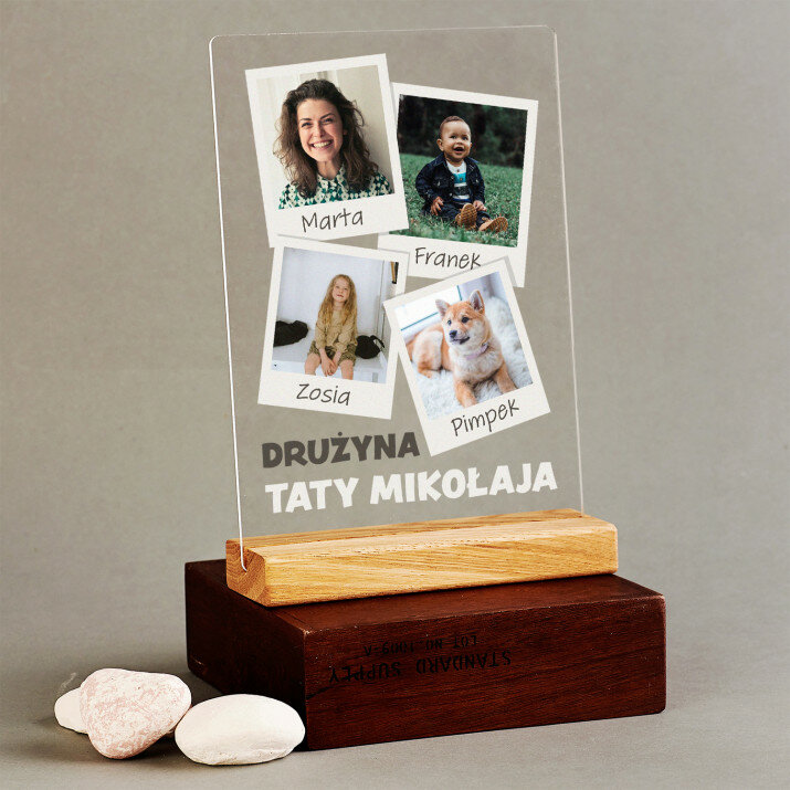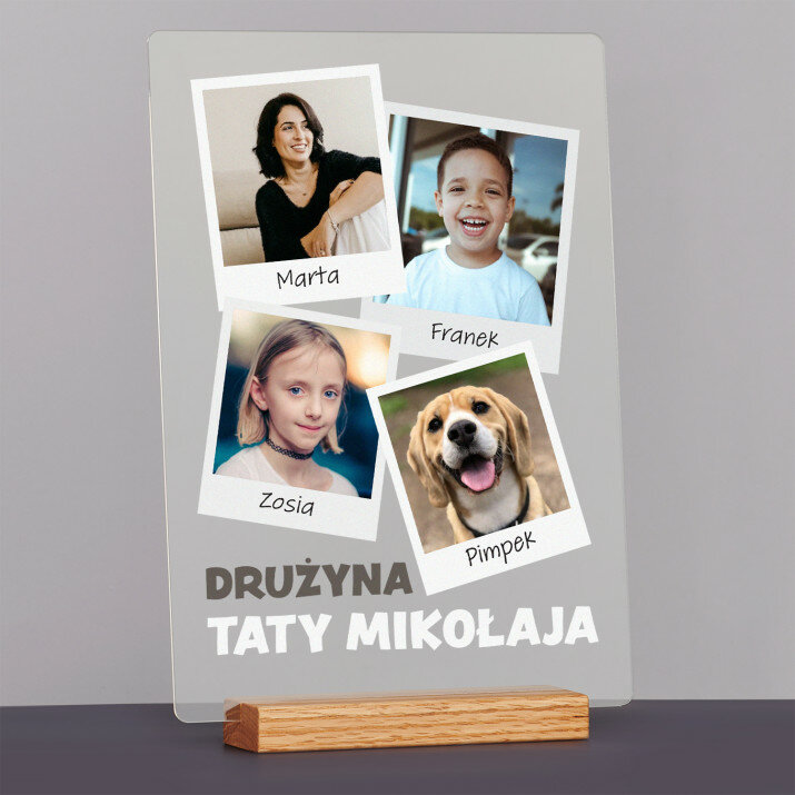 Wydruk na szkle akrylowym z podstawką drewnianą.