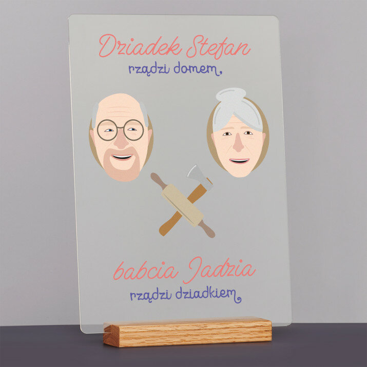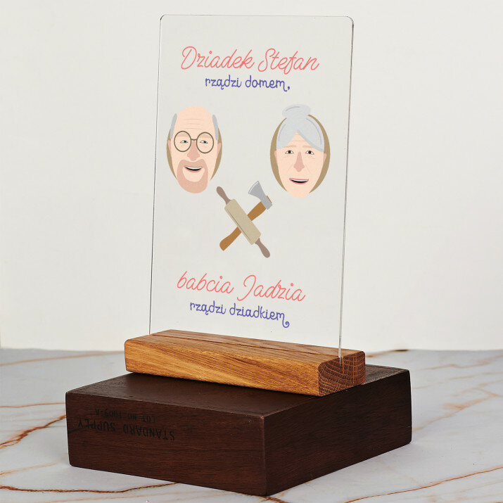Wydruk na szkle akrylowym z podstawką drewnianą.