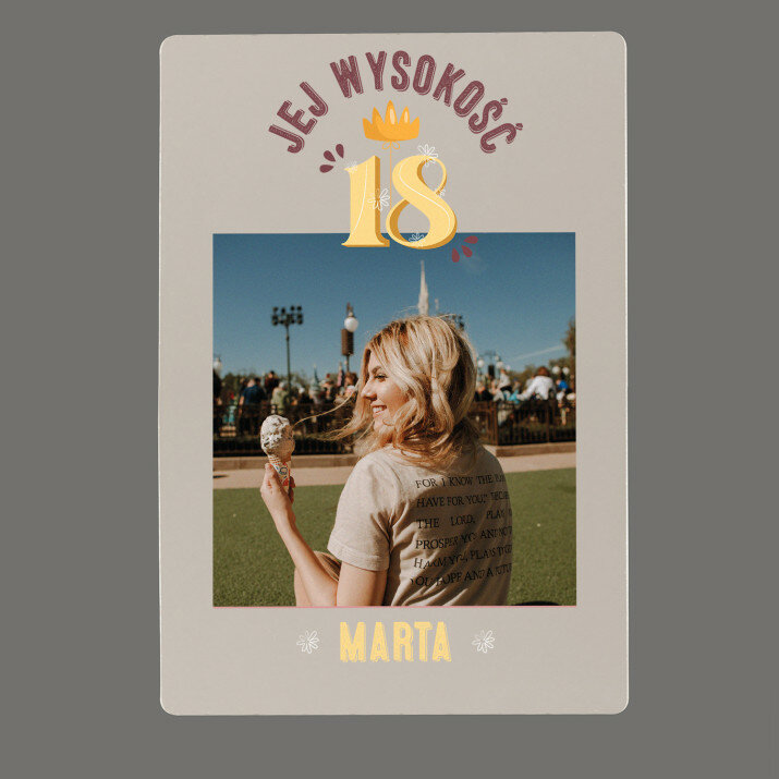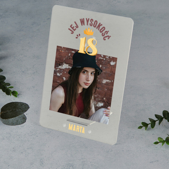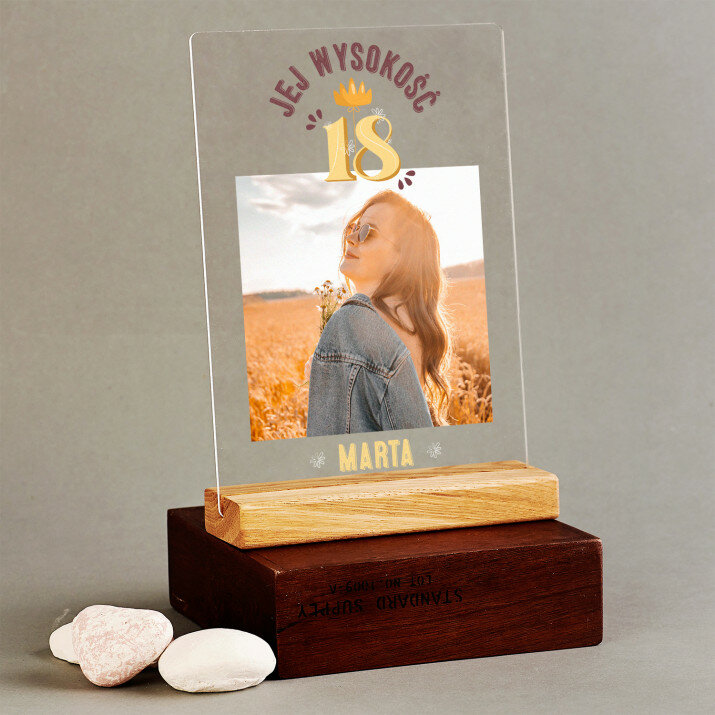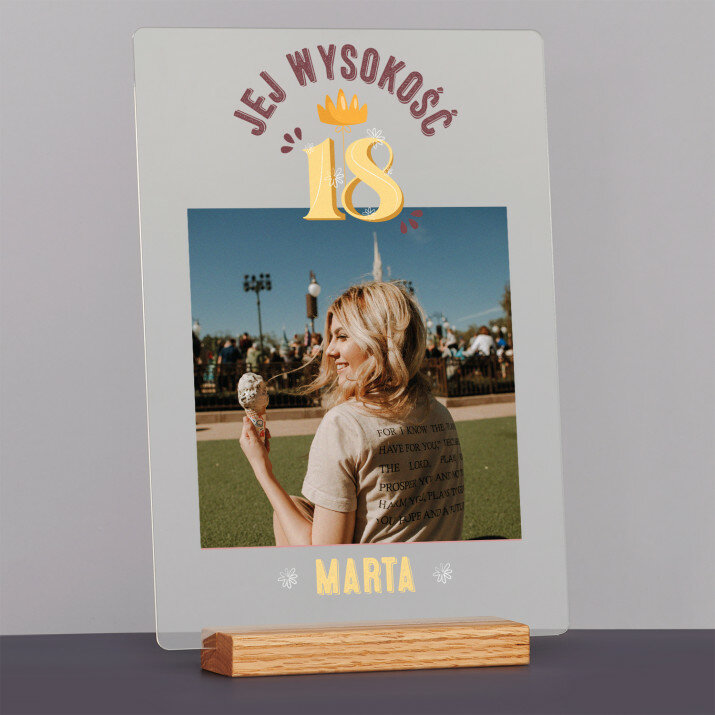 Wydruk na szkle akrylowym z podstawką Jej wysokość 18 to wspaniały prezent dla każdej osiemnastolatki. Jakość wykonania jest imponująca, a personalizacja dodaje mu wyjątkowego charakteru.