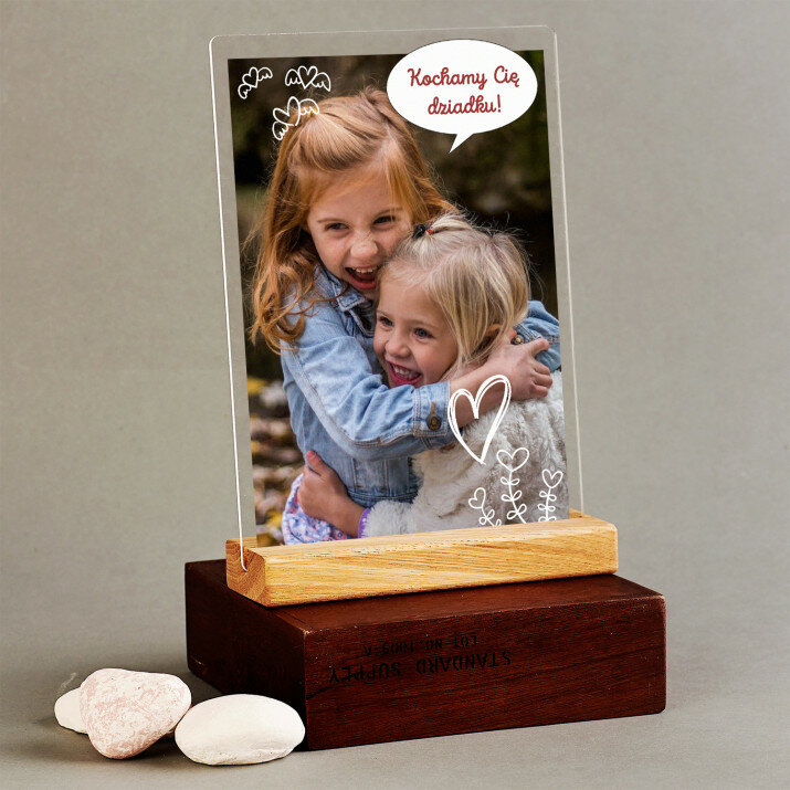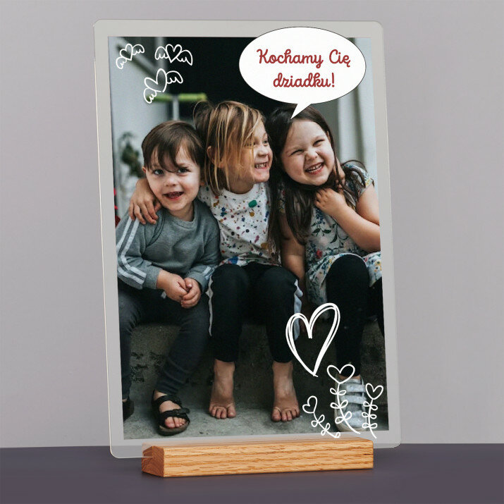 Wyjątkowa pamiątka, która zachwyci obdarowaną osobę! Wydruk na bezbarwnym szkle akrylowym (pleksiglas) o grubości 2 mm to upominek na lata. Materiał wyróżnia się doskonałą jakością powierzchni i sztywnością, jest odporny na uszkodzenia oraz warunki atmosferyczne. Dzięki eleganckiej, drewnianej podstawce wydruk można od razu postawić na półce. Gwarantujemy, że będzie to świetna niespodzianka dla Twoich bliskich!Oferujemy cztery różne opcje dla tego wydruku: