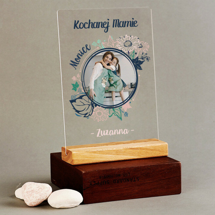 Wydruk na szkle akrylowym z podstawką drewnianą.