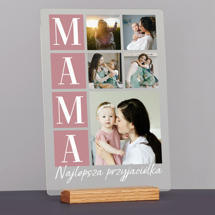 Wydruk na szkle akrylowym z podstawką drewnianą.