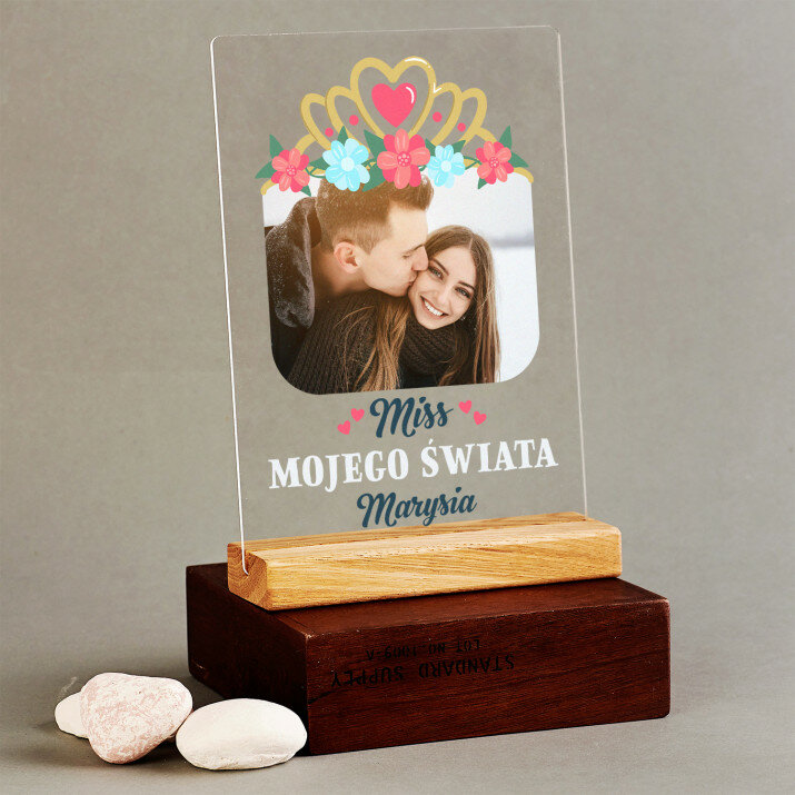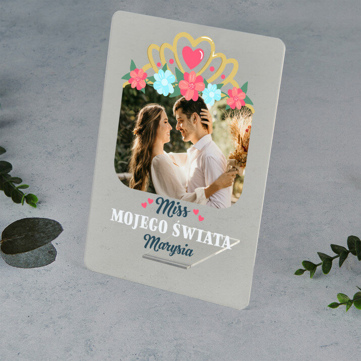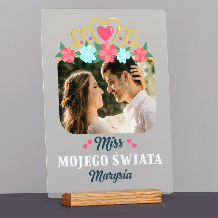 Miss mojego świata - Wydruk na szkle akrylowym z podstawką to wspaniały prezent dla mojej ukochanej, która jest dla mnie najważniejsza na świecie!