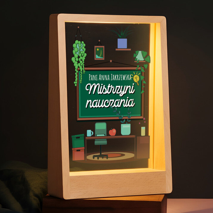 Wydruk na szkle akrylowym z podstawką drewnianą.