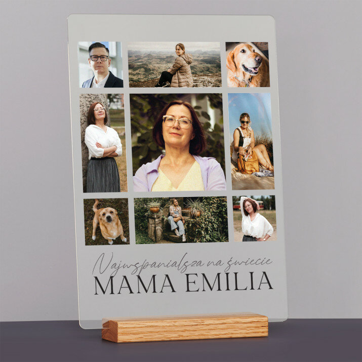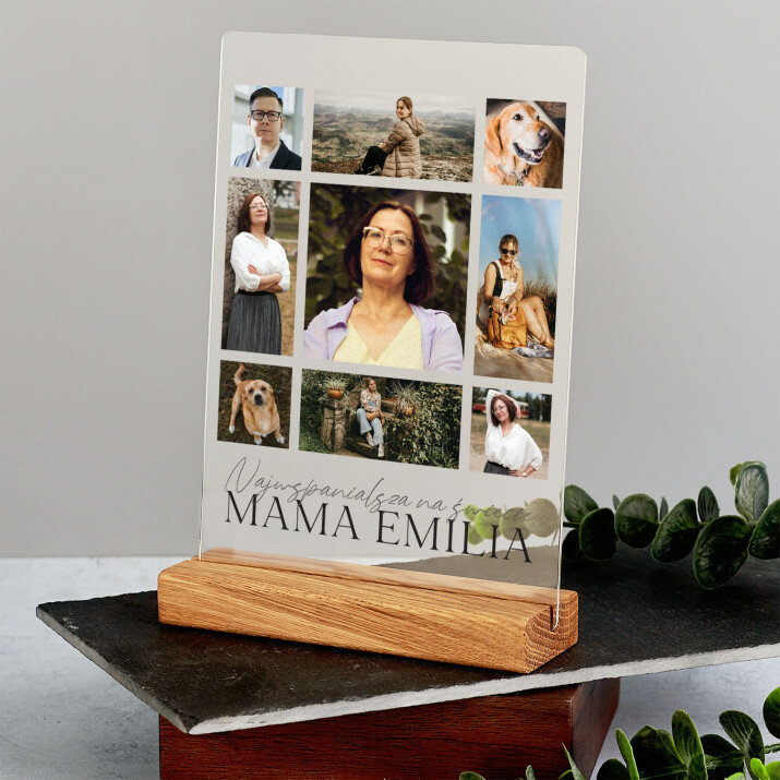 Wydruk na szkle akrylowym z podstawką drewnianą.