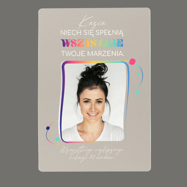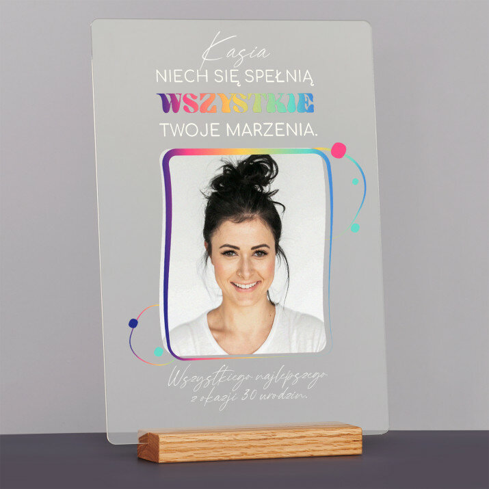 Wyjątkowa pamiątka, która zachwyci obdarowaną osobę! Wydruk na bezbarwnym szkle akrylowym (pleksiglas) o grubości 2 mm to upominek na lata. Materiał wyróżnia się doskonałą jakością powierzchni i sztywnością, jest odporny na uszkodzenia oraz warunki atmosferyczne. Dzięki eleganckiej, drewnianej podstawce wydruk można od razu postawić na półce. Gwarantujemy, że będzie to świetna niespodzianka dla Twoich bliskich!Oferujemy cztery różne opcje dla tego wydruku:
