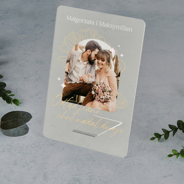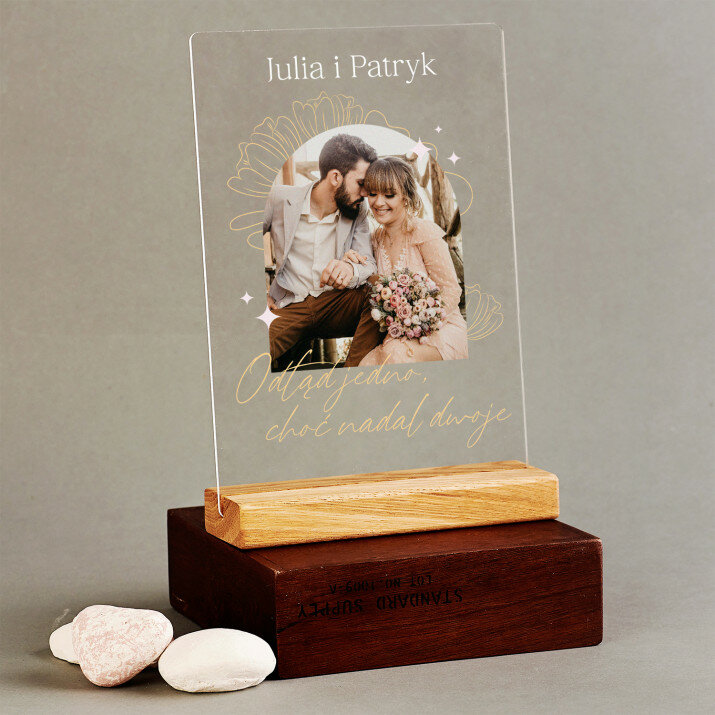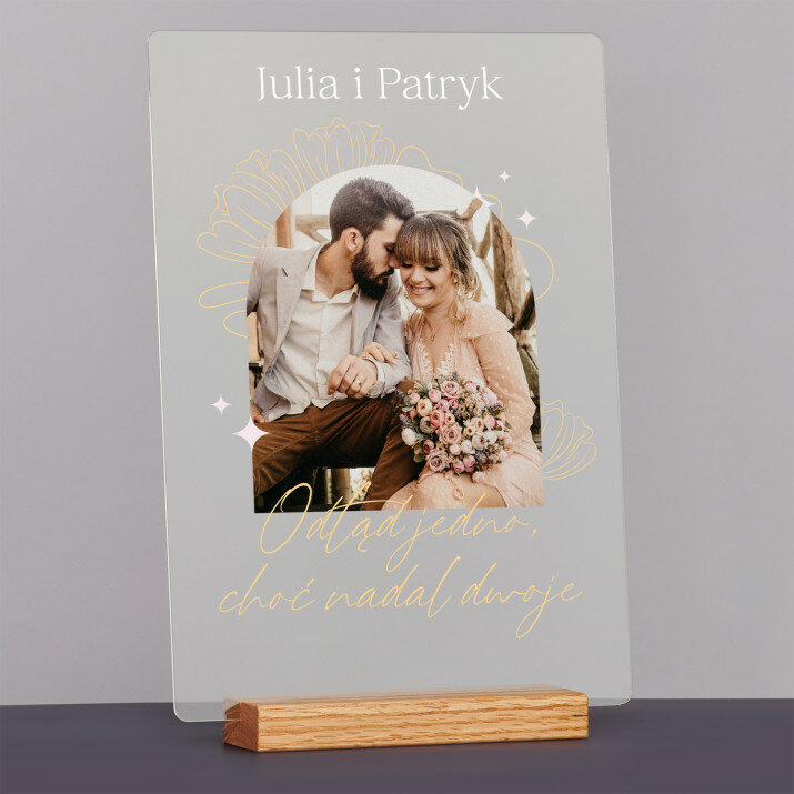 Wyjątkowa pamiątka, która zachwyci obdarowaną osobę! Wydruk na bezbarwnym szkle akrylowym (pleksiglas) o grubości 2 mm to upominek na lata. Materiał wyróżnia się doskonałą jakością powierzchni i sztywnością, jest odporny na uszkodzenia oraz warunki atmosferyczne. Dzięki eleganckiej, drewnianej podstawce wydruk można od razu postawić na półce. Gwarantujemy, że będzie to świetna niespodzianka dla Twoich bliskich!Oferujemy cztery różne opcje dla tego wydruku:
