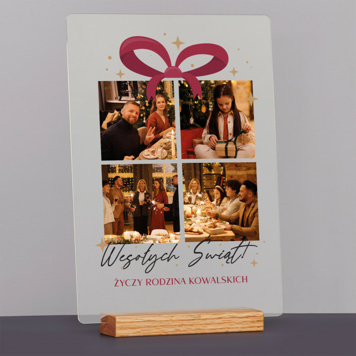 Wydruk na szkle akrylowym z podstawką drewnianą.