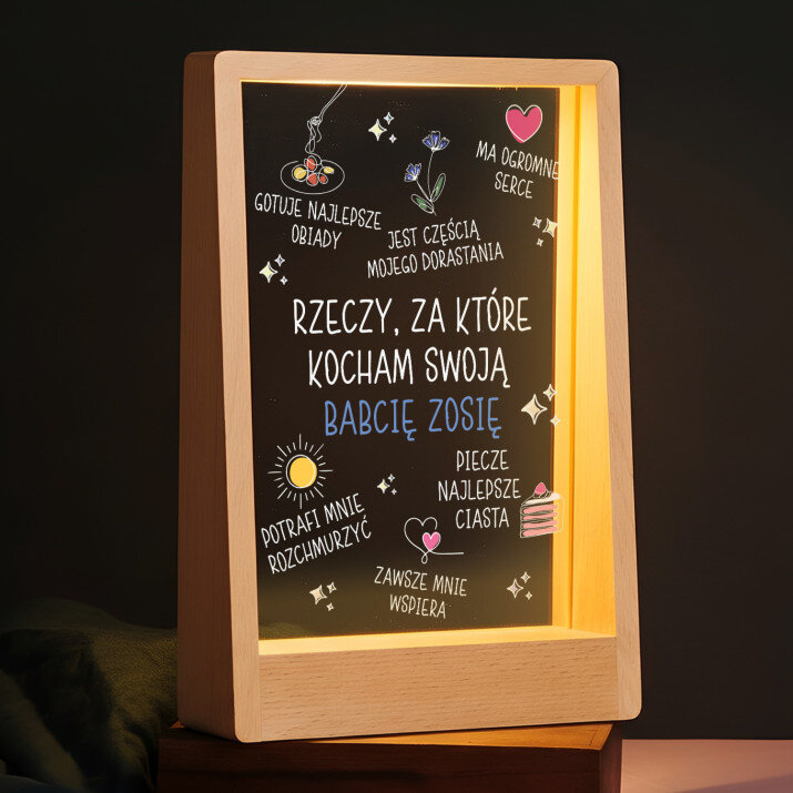 Wydruk na szkle akrylowym z podstawką drewnianą.
