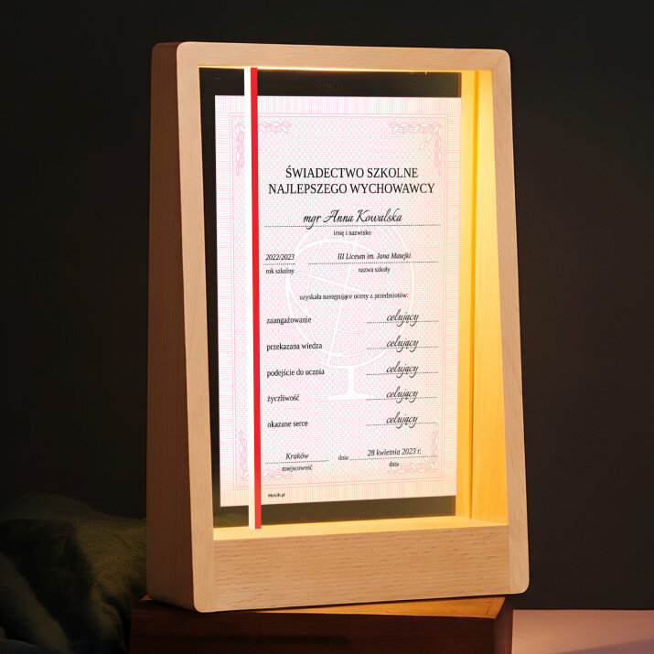 To piękny wydruk na szkle w różowym kolorze, idealny prezent dla naszego ukochanego wychowawcy.