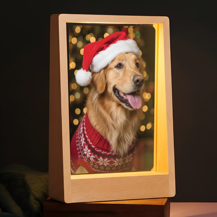 Wydruk na szkle akrylowym z podstawką drewnianą.