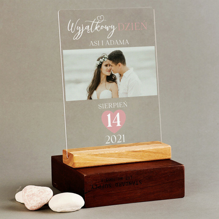 Wyjątkowa pamiątka, która zachwyci obdarowaną osobę! Wydruk na bezbarwnym szkle akrylowym (pleksiglas) o grubości 2 mm to upominek na lata. Materiał wyróżnia się doskonałą jakością powierzchni i sztywnością, jest odporny na uszkodzenia oraz warunki atmosferyczne. Dzięki eleganckiej, drewnianej podstawce wydruk można od razu postawić na półce. Gwarantujemy, że będzie to świetna niespodzianka dla Twoich bliskich!Oferujemy cztery różne opcje dla tego wydruku: