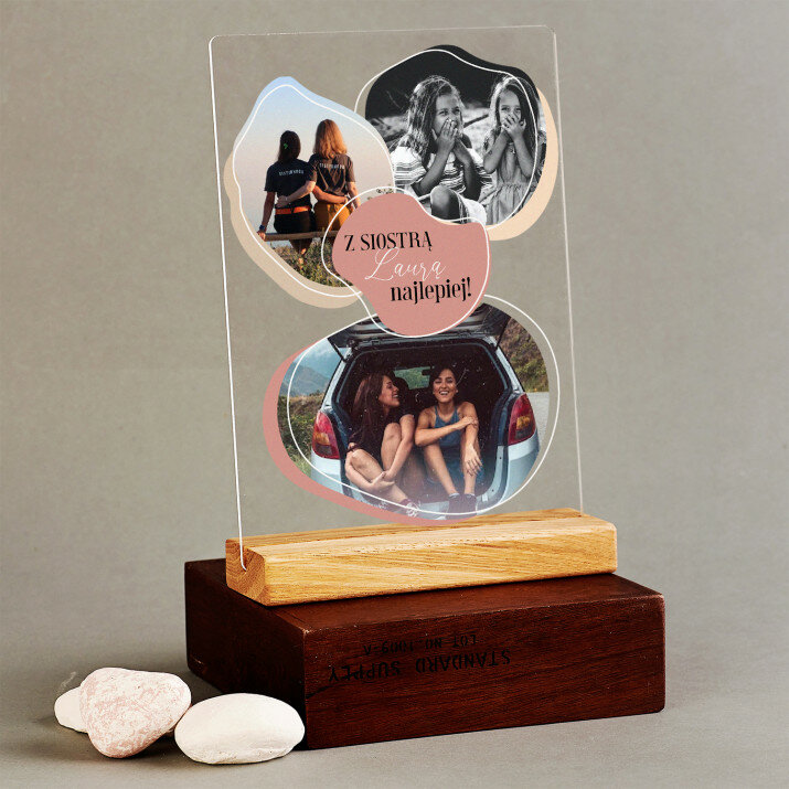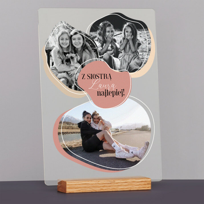 Wydruk na szkle akrylowym z podstawką drewnianą.