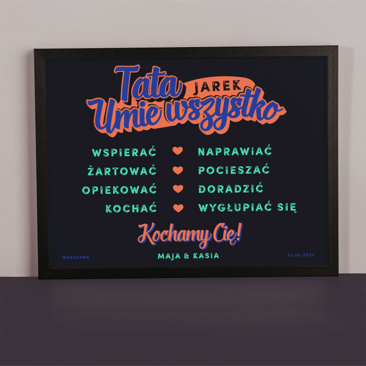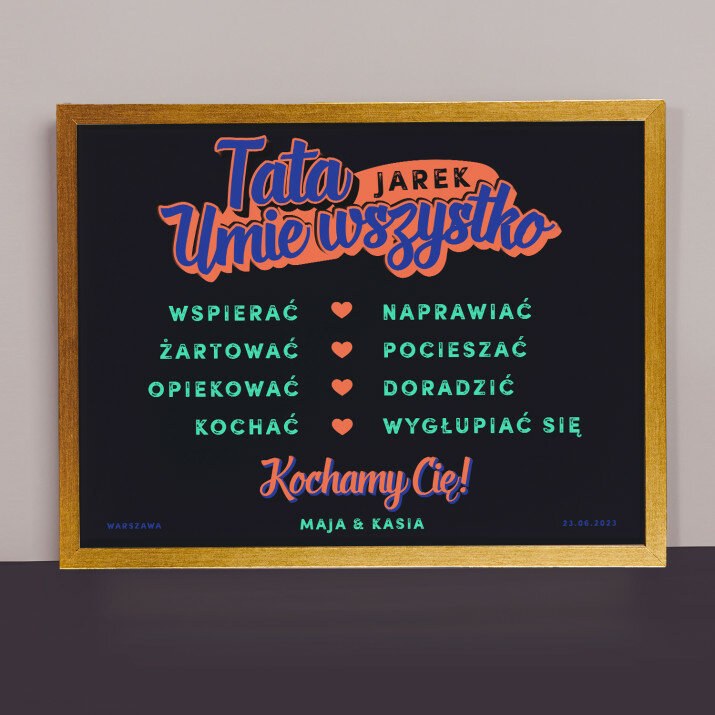 Wydruk w ramce to efektowny plakat, którego treść jest w pełni personalizowana i dopasowana do ważnej okazji. Taki podarunek podkreśla wyjątkowy charakter uroczystości i pozostaje fajną pamiątką na lata. Wystarczy, że podasz nam informacje do wstawienia, a my wyczarujemy dla Ciebie upominek, który zaskoczy Twoich bliskich!Personalizacja