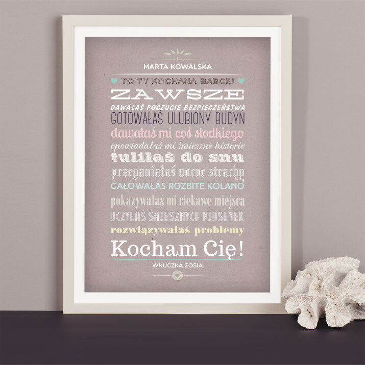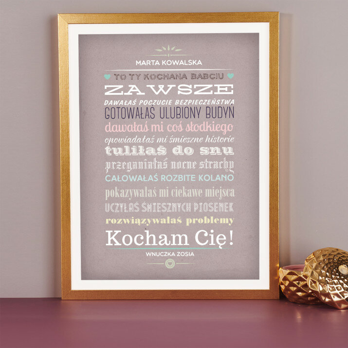 Wydruk w ramce to efektowny plakat, którego treść jest w pełni personalizowana i dopasowana do ważnej okazji. Taki podarunek podkreśla wyjątkowy charakter uroczystości i pozostaje fajną pamiątką na lata. Wystarczy, że podasz nam informacje do wstawienia, a my wyczarujemy dla Ciebie upominek, który zaskoczy Twoich bliskich!Wykonanie