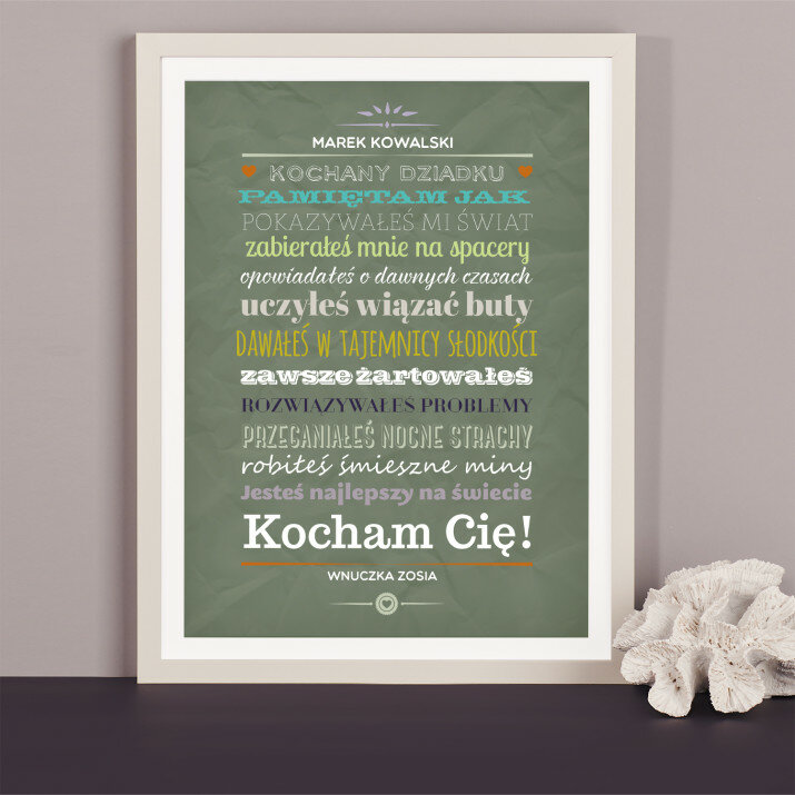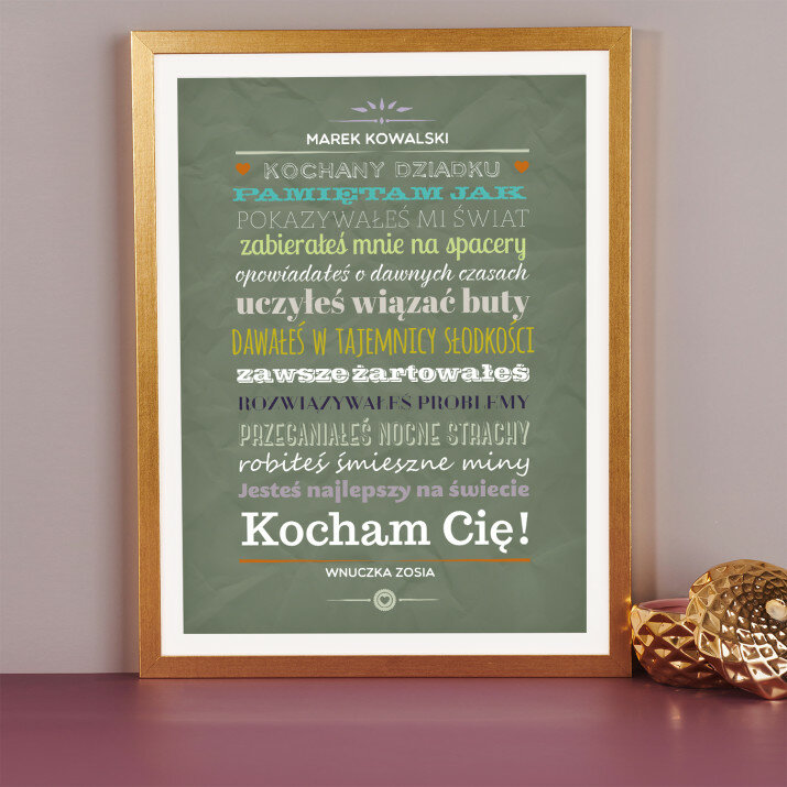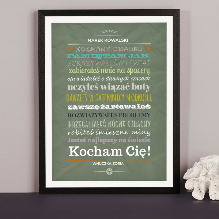 Wydruk w ramce to efektowny plakat, którego treść jest w pełni personalizowana i dopasowana do ważnej okazji. Taki podarunek podkreśla wyjątkowy charakter uroczystości i pozostaje fajną pamiątką na lata. Wystarczy, że podasz nam informacje do wstawienia, a my wyczarujemy dla Ciebie upominek, który zaskoczy Twoich bliskich!Wykonanie