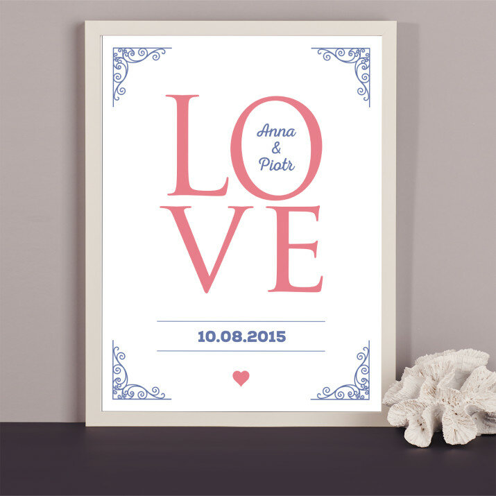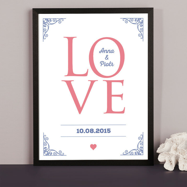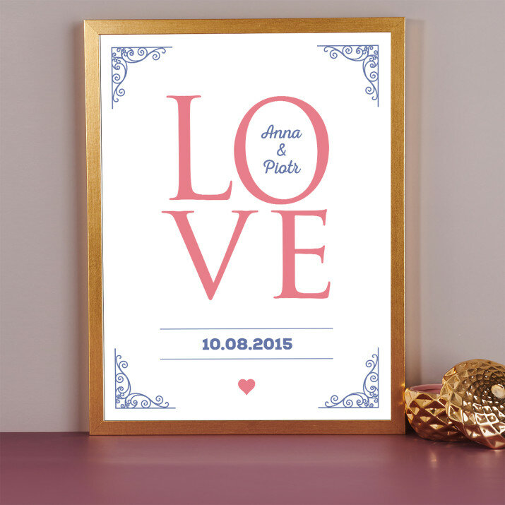 Wspaniały prezent, pamiątka ważnego dnia zakochanej pary - zamknij w słowie LOVE ich imiona i datę i przekaż w formie pięknego plakatu.