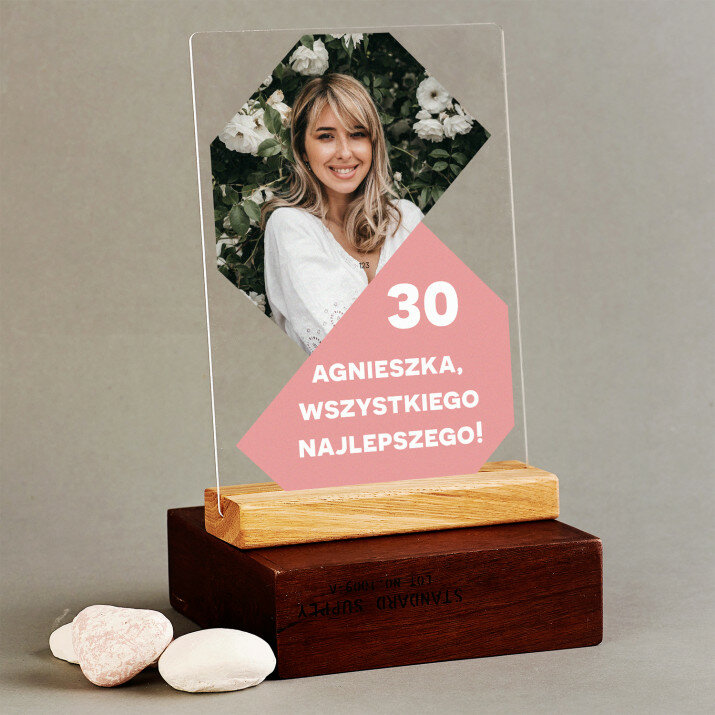 Wyjątkowa pamiątka, która zachwyci obdarowaną osobę! Wydruk na bezbarwnym szkle akrylowym (pleksiglas) o grubości 2 mm to upominek na lata. Materiał wyróżnia się doskonałą jakością powierzchni i sztywnością, jest odporny na uszkodzenia oraz warunki atmosferyczne. Dzięki eleganckiej, drewnianej podstawce wydruk można od razu postawić na półce. Gwarantujemy, że będzie to świetna niespodzianka dla Twoich bliskich!Oferujemy cztery różne opcje dla tego wydruku: