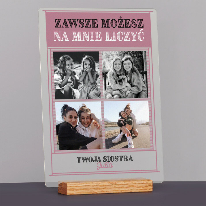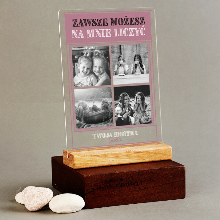 Wydruk na szkle akrylowym z podstawką drewnianą.