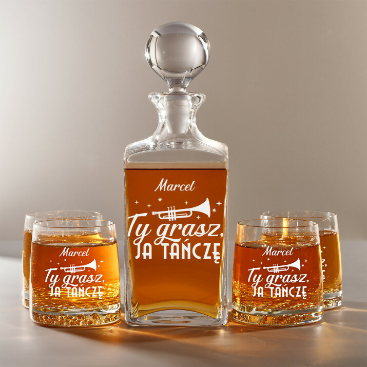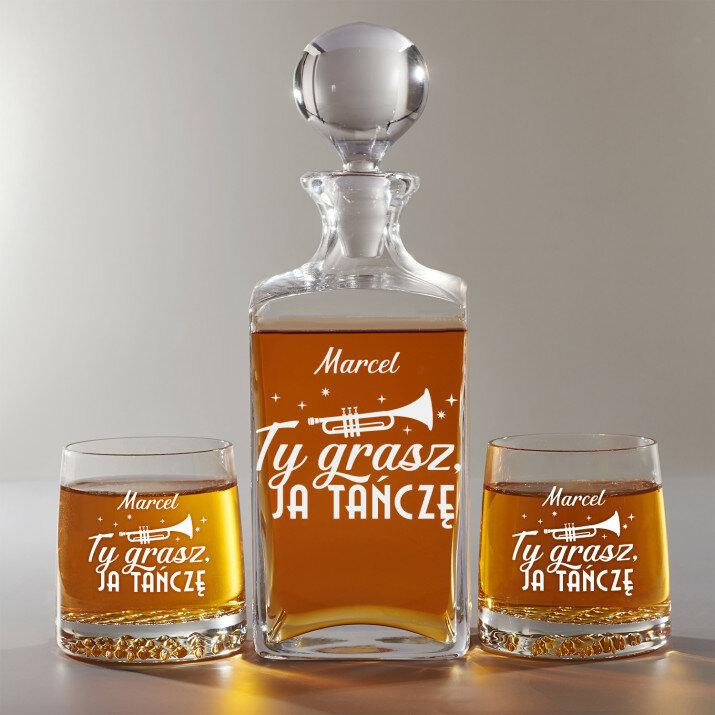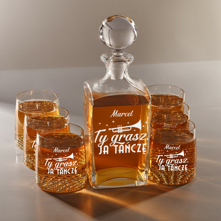Zestaw z grawerowaną karafką i szklankami dostępny w czterech wariantach:Karafka + 1 szklanka
