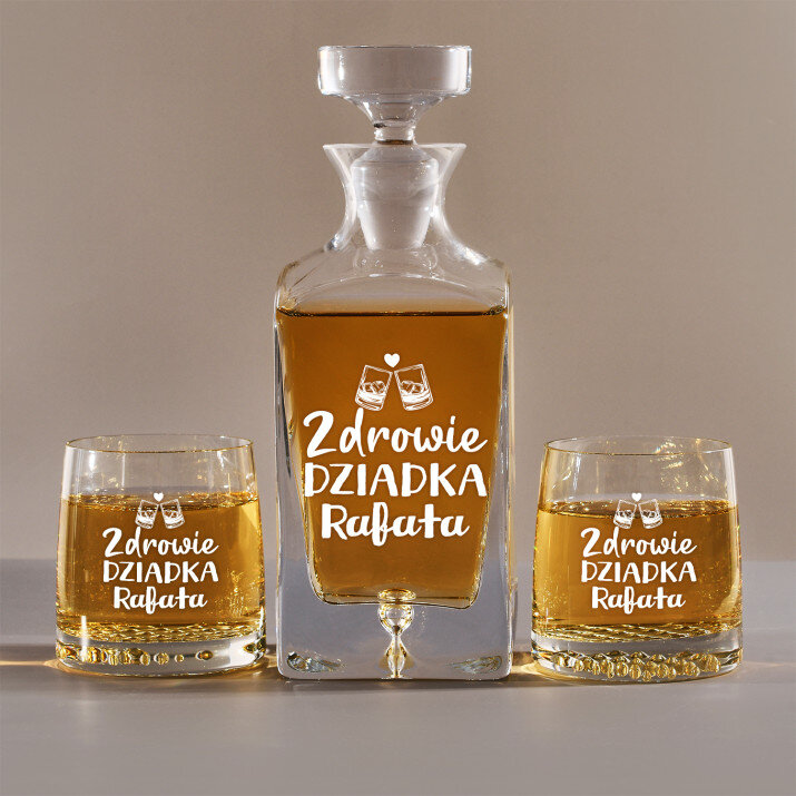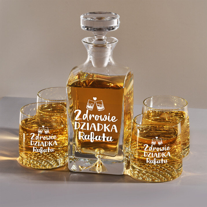 Zestaw z grawerowaną karafką i szklankami dostępny w czterech wariantach:Karafka + 1 szklanka