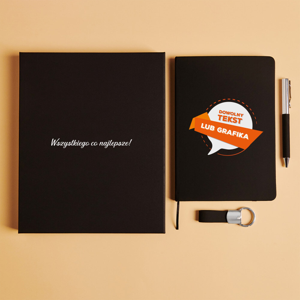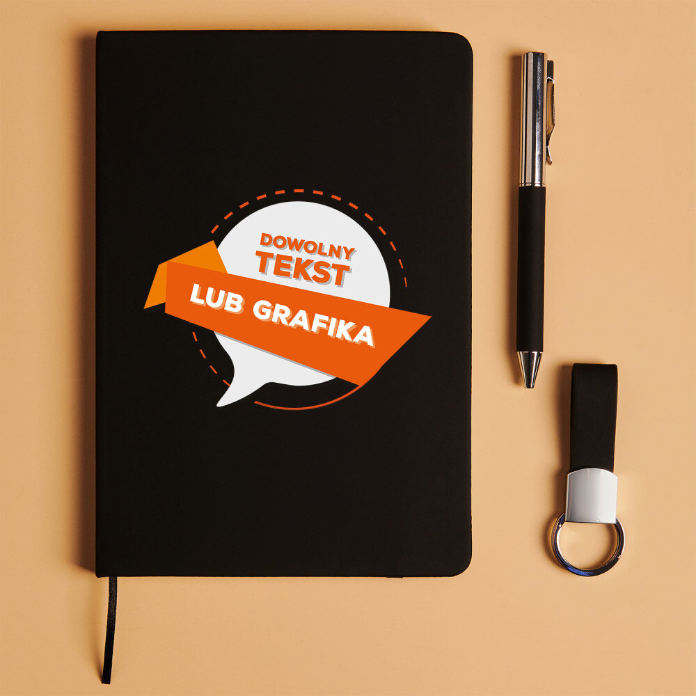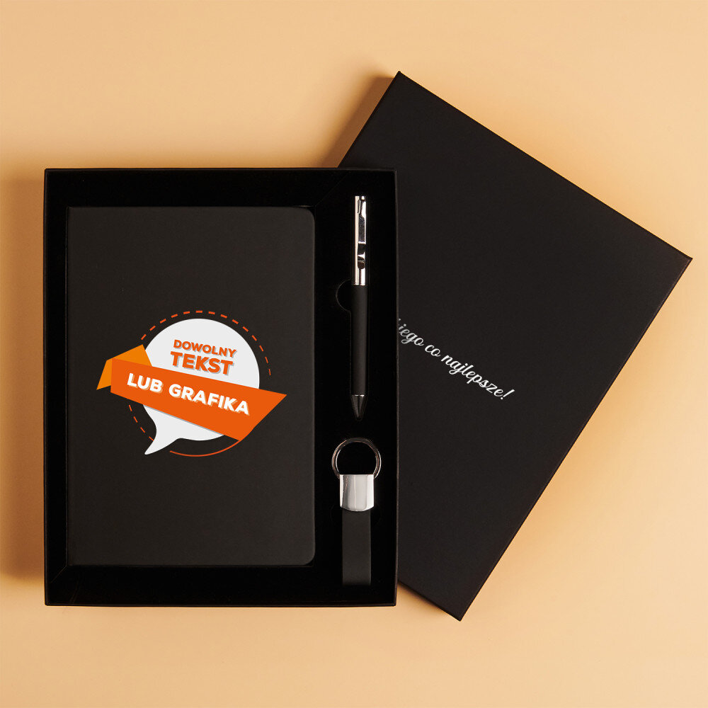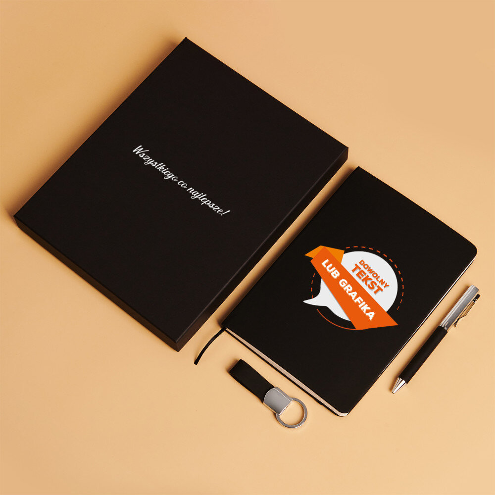 Personalizowany zestaw z notatnikiem to świetny pomysł na prezent, który idealnie sprawdzi się na wiele okazji Czarna, klasyczna okładka notatnika dodaje mu elegancji. Do zestawu dołączony jest długopis oraz pendrive. Całość zapakowana w prezentowe pudełko, gotowe do wręczenia.NADRUK