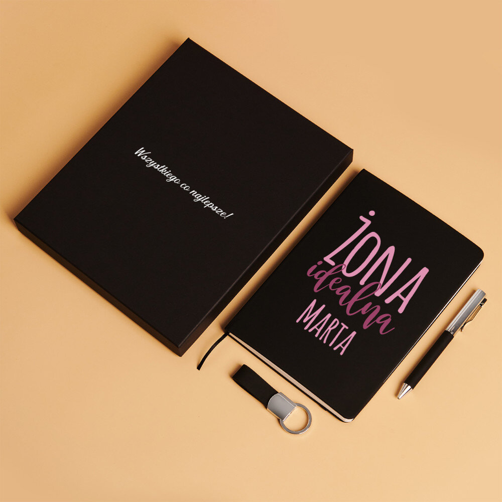 Personalizowany zestaw z notatnikiem to świetny pomysł na prezent, który idealnie sprawdzi się na wiele okazji Czarna, klasyczna okładka notatnika dodaje mu elegancji. Do zestawu dołączony jest długopis oraz pendrive. Całość zapakowana w prezentowe pudełko, gotowe do wręczenia.