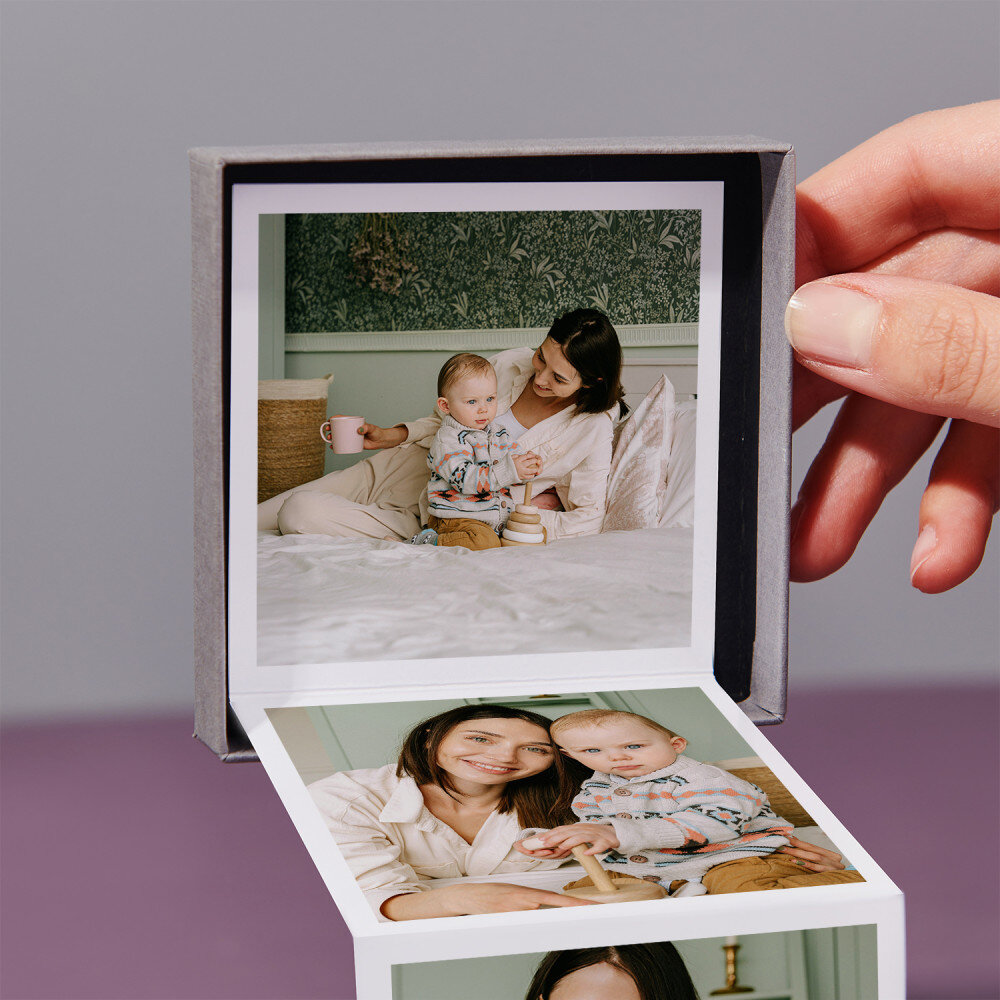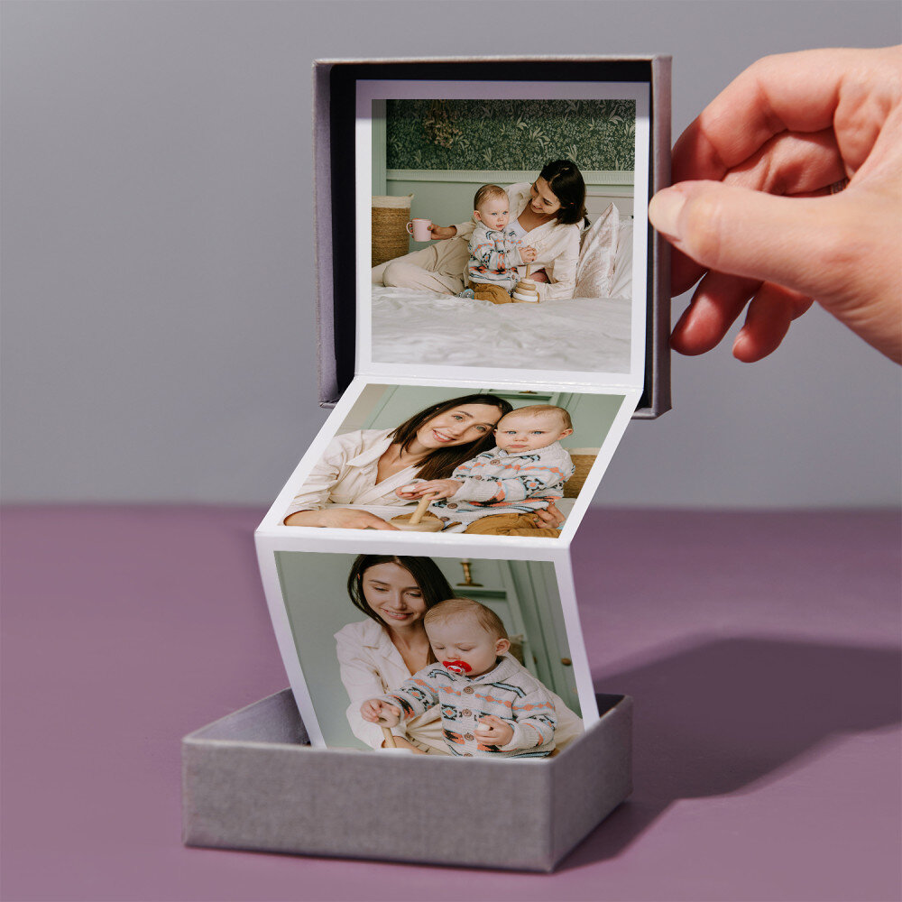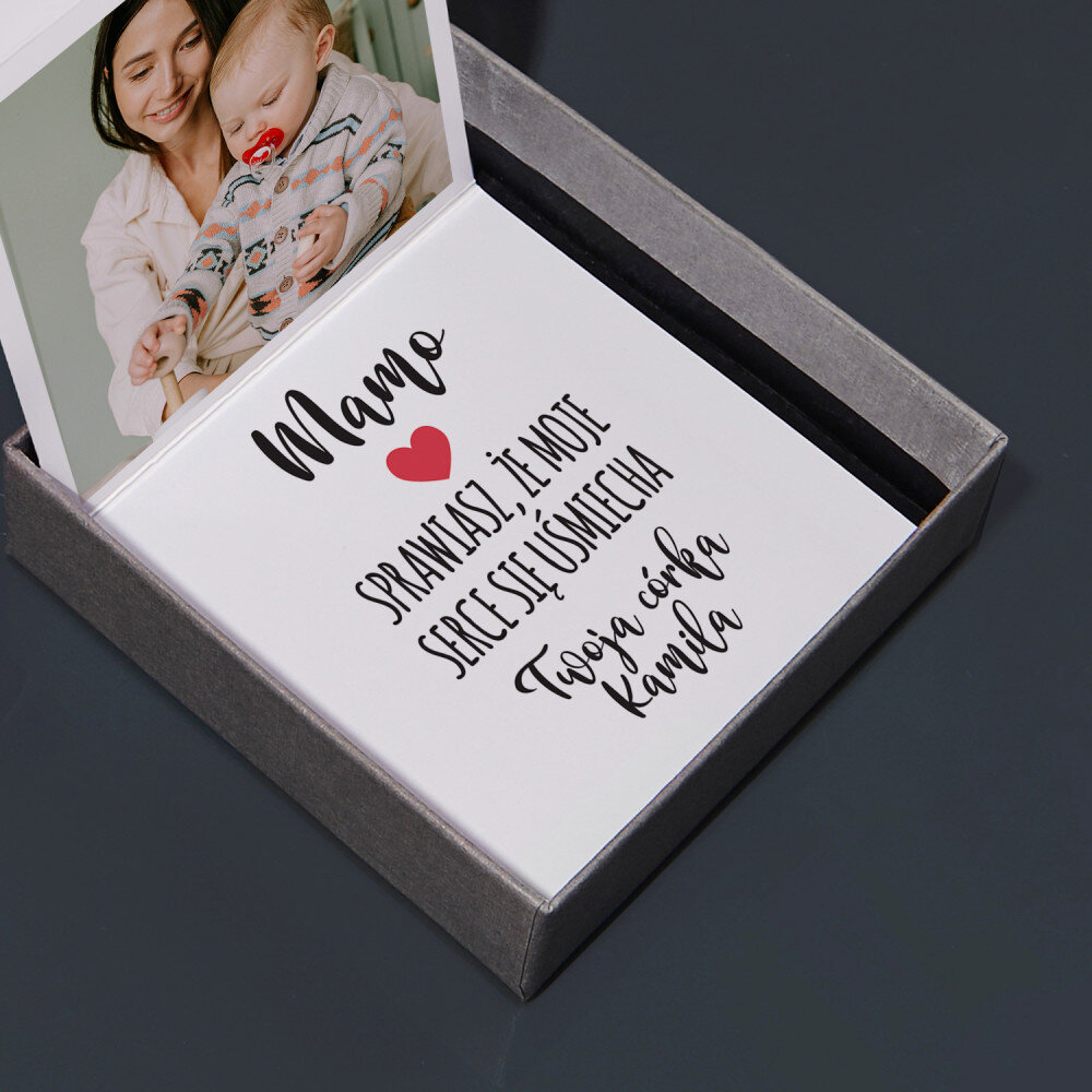 Twoje zdjęcia zostaną wydrukowane w technologii cyfrowej na wysokiej jakości papierze o gramaturze 300 g/m2. Nadruk wygląda pięknie, kolory są nasycone, efekt trwały. Ułożoną w harmonijkę kompozycję fotografii wklejamy do prezentowego pudełeczka o wymiarach 86 x 86 x 26 mm.Harmonijka składa się z trzech zdjęć o wymiarach 6,68 x 6,68 cm oraz spersonalizowanej kartki z wybranym przez Ciebie wzorem. Wokół zdjęć znajduje się biała ramka. Wymiary każdej strony razem z ramką: 7,5 x 7,5 cm.
