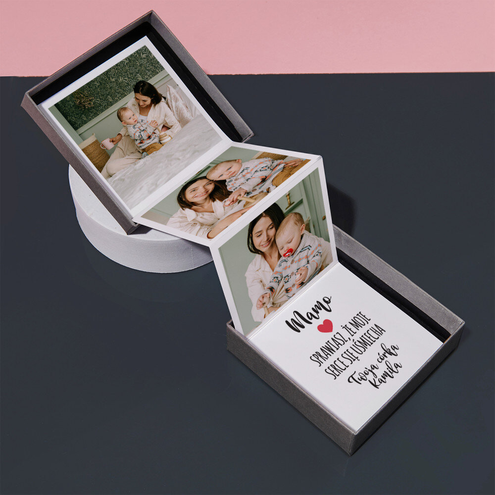 Upominki ze zdjęciami zawsze się sprawdzają! Podarowanie takiej harmonijki sprawi radość bliskiej osobie, a przy okazji Wasze piękne chwile zostaną zamienione w pomysłową pamiątkę. Fotografie są estetycznie zapakowane w stylowym pudełeczku, dzięki czemu obdarowana osoba będzie mogła komfortowo zabrać je nawet w podróż dookoła świata! Do zdjęć dołączona jest jeszcze jedna karteczka z personalizowanym wzorem na specjalną okazję.WYKONANIE