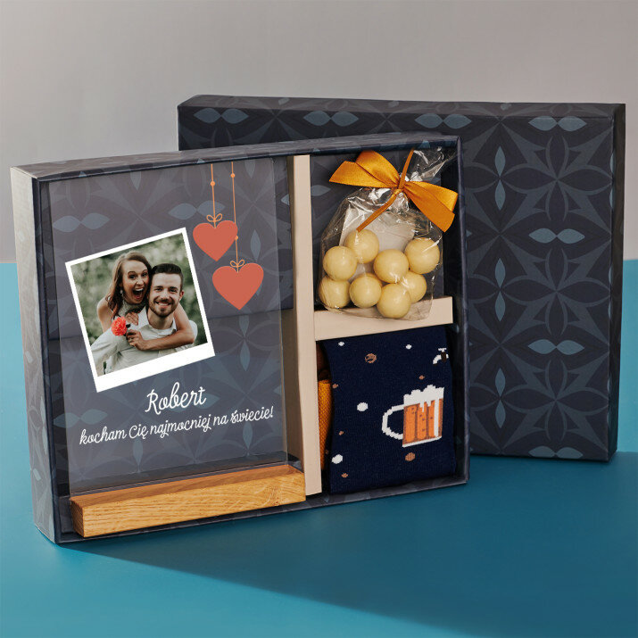 1. Wydruk na szkle akrylowym to wyjątkowa pamiątka, która zachwyci obdarowaną osobę! Piękny upominek z personalizacją przywołuje wspomnienia i emocje związane z bliskimi. Osobisty akcent sprawia, że wydruk jest niepowtarzalną pamiątką.2. Zestaw skarpetek - idealnie uzupełni codzienną stylizację, dodając odrobinę charakteru.