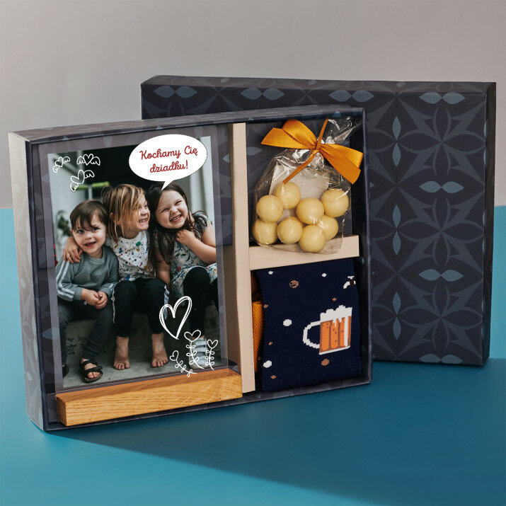 1. Wydruk na szkle akrylowym to wyjątkowa pamiątka, która zachwyci obdarowaną osobę! Piękny upominek z personalizacją przywołuje wspomnienia i emocje związane z bliskimi. Osobisty akcent sprawia, że wydruk jest niepowtarzalną pamiątką.2. Zestaw skarpetek - idealnie uzupełni codzienną stylizację, dodając odrobinę charakteru.